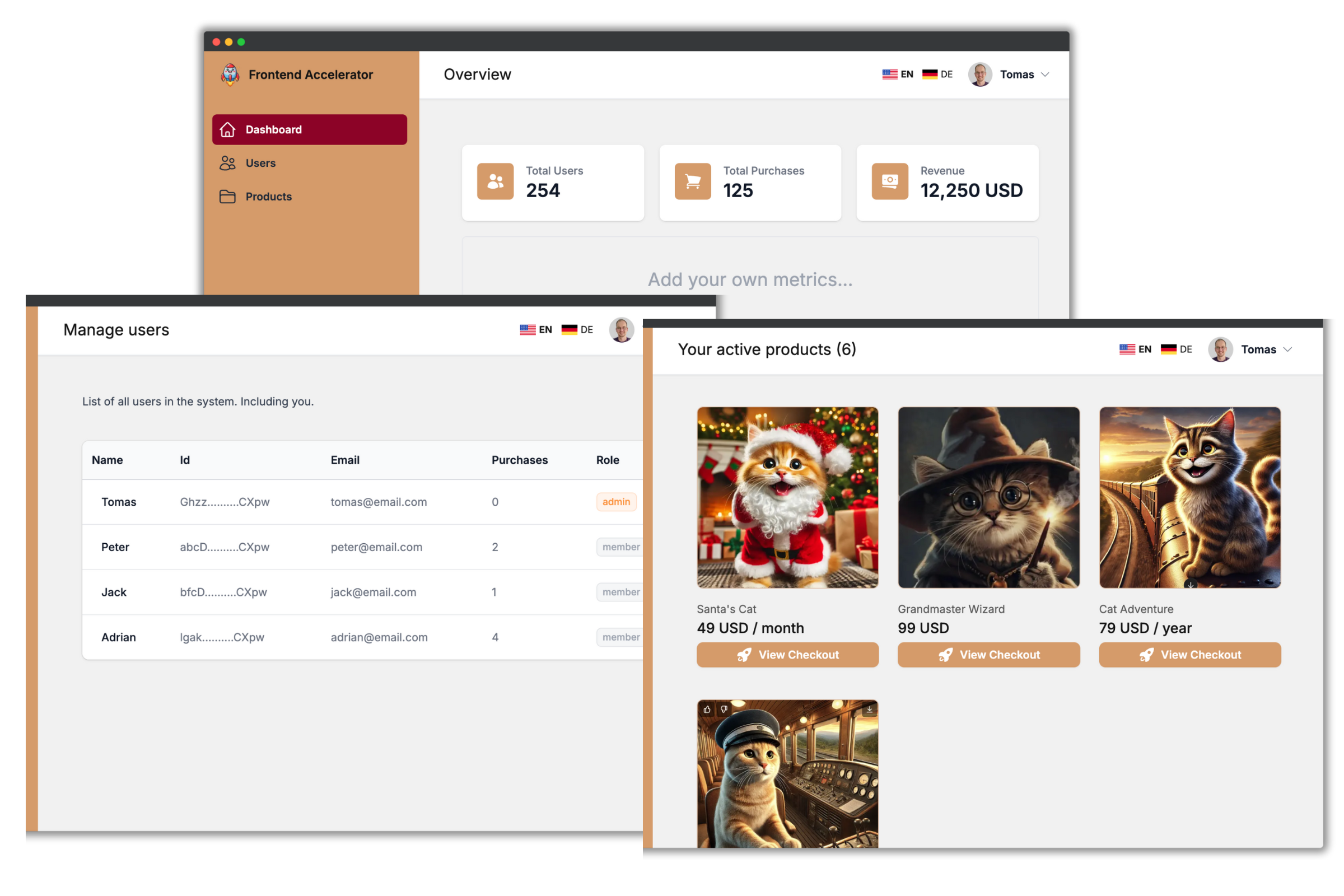 Fully extendable Admin & Member dashboards with role-based access to give you a solid starting point for managing your SaaS. View your customers, products and key metrics!
